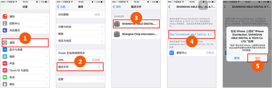 IOS用戶打開課程中心APP時,若提示“未受信任的企業級開發者”,請按照以下5個步驟進行操作: